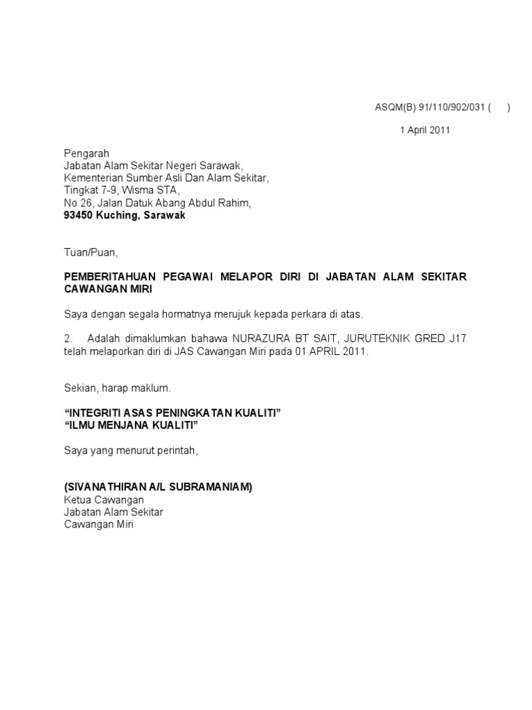 Hailmi SMK Luar Bandar No1 Sibu Km 334 Jalan Oya 96000 Sibu Sarawak Melalui dan salinan kepada Pengetua SMK Luar Bandar. Format b pengarah pelajaran. Lapor diri bertugas di tempat.