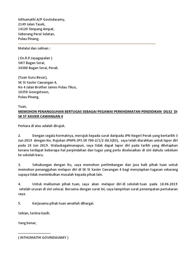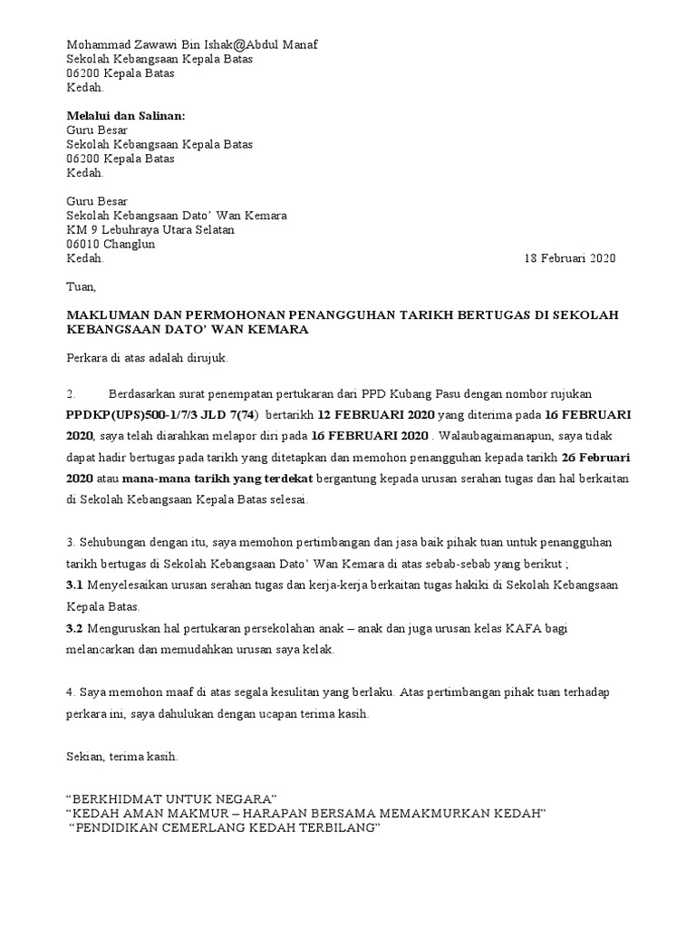 Surat Penangguhan Lapor Diri Kerajaan - Tangguh Lapor Diri Ini Contoh Surat Penangguhan Lapor Diri Bertugas. Format b pengarah pelajaran. Hadir Bertugas Contoh Surat Lapor Diri Bertugas.